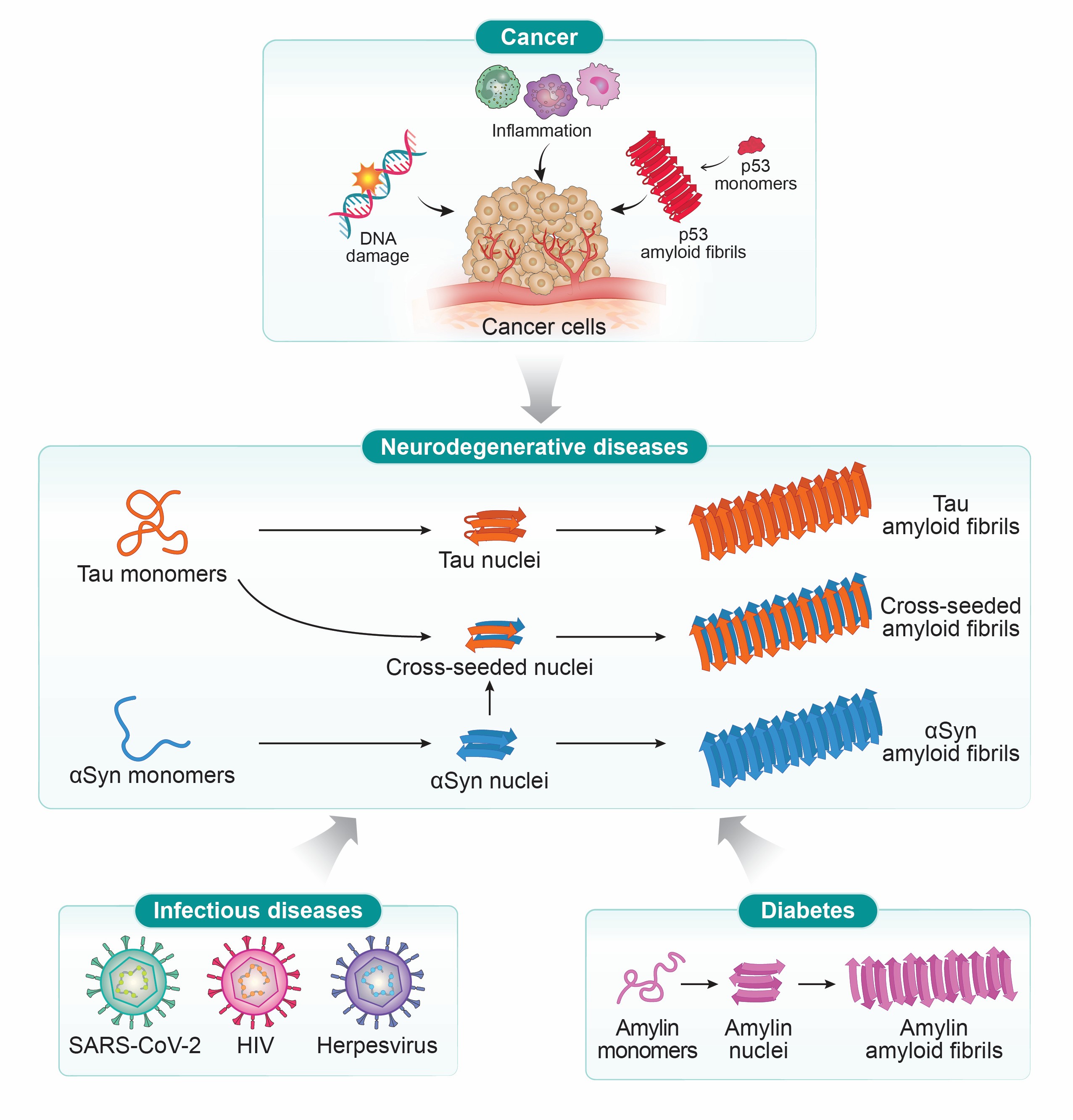 연구진은 임상적으로 서로 다른 양상을 보이는 신경퇴행성 질환, 암, 감염병, 제2형 당뇨병이 단백질 오접힘(Protein Misfolding)*과 응집(Aggregation)*, 만성 염증, 신호전달 경로 이상과 같은 공통된 분자적 과정을 가진다는 점에 주목하였다. 특히, 단백질 오접힘과 응집을 통한 크로스 시딩(Cross-seeding)* 현상으로 서로 다른 단백질 간의 상호작용이 가능함을 확인하고, 이로 인해 신경퇴행성 질환 내 질환-질환 간 연계성과 공병리(Co-pathology)*가 발생함을 규명하였다.
