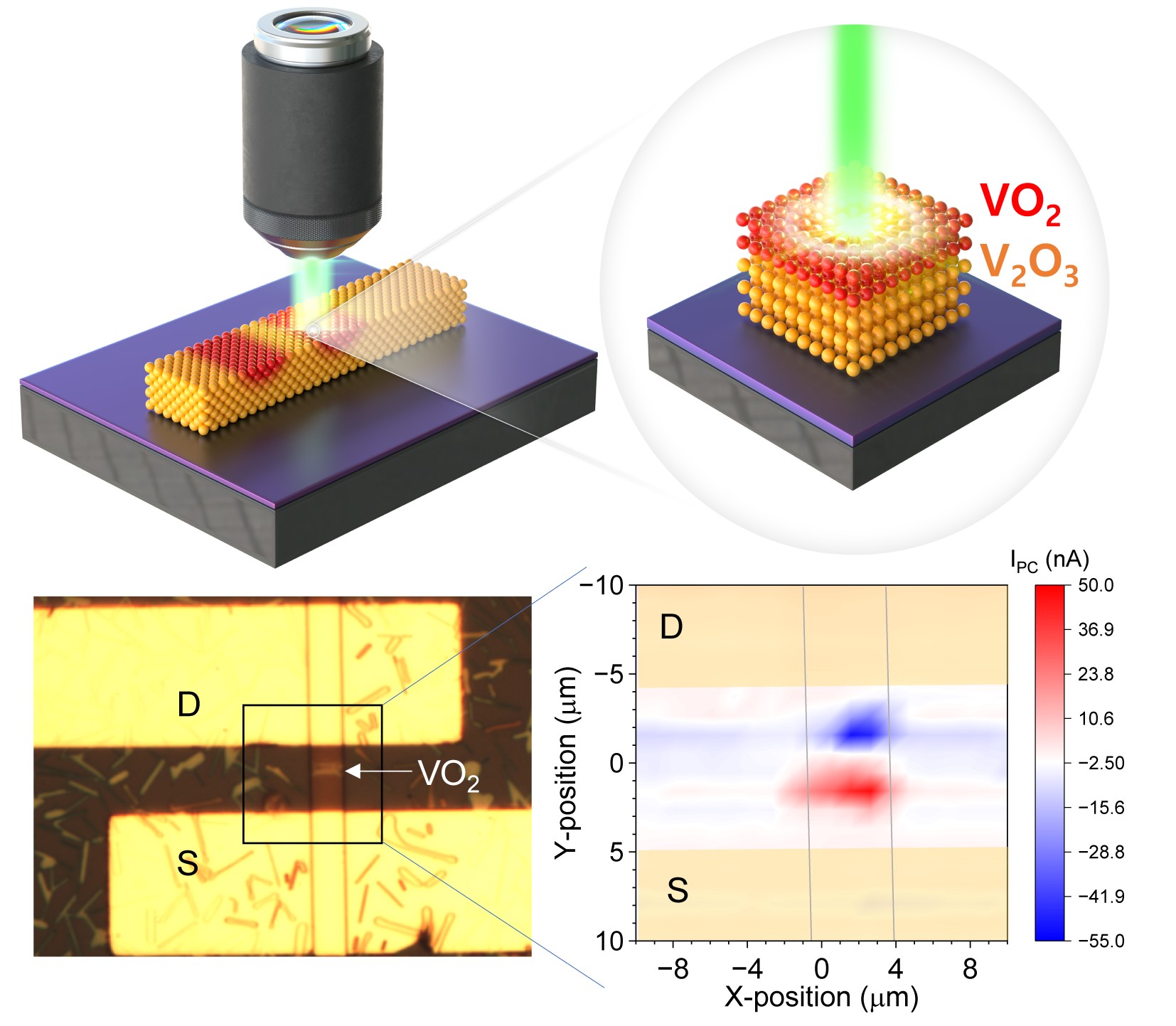 한국기초과학지원연구원(원장 양성광, 이하 KBSI) 전략장비개발연구단 홍웅기 박사 연구팀은 국내 라만장비 전문기업 ㈜위브와 함께 기존 국산 라만분광 시스템에 주사형 광전류 이미징 기능을 통합한 ‘라만분광–주사형 광전류 이미징 융합분석시스템’*을 고도화했다. 연구팀은 이 장비를 활용해 상변화 산화물 반도체(V2O3, VO2)*의 원자 배열을 레이저로 정밀 제어하는 ‘토포택틱 상전이’ *기술을 구현하고, 이를 기반으로 재구성 가능한 반도체 소자*를 실제 제작하는 데 성공했다.
